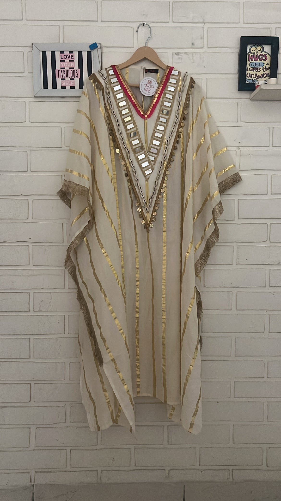 Make a powerful yet effortless statement with this ivory and gold striped cotton kaftan, featuring a handcrafted original mirror-work neckline that adds a touch of sparkle and sophistication. Perfect for card parties, family get-togethers, or Raksha Bandhan celebrations, this kaftan combines comfort with festive elegance. The classic ivory and gold palette gives it a luxurious, regal vibe, ensuring you stand out while feeling easy and breezy.