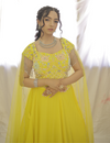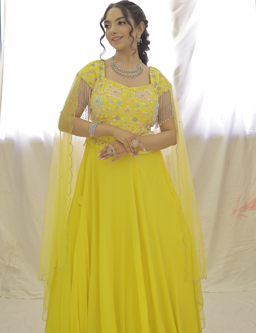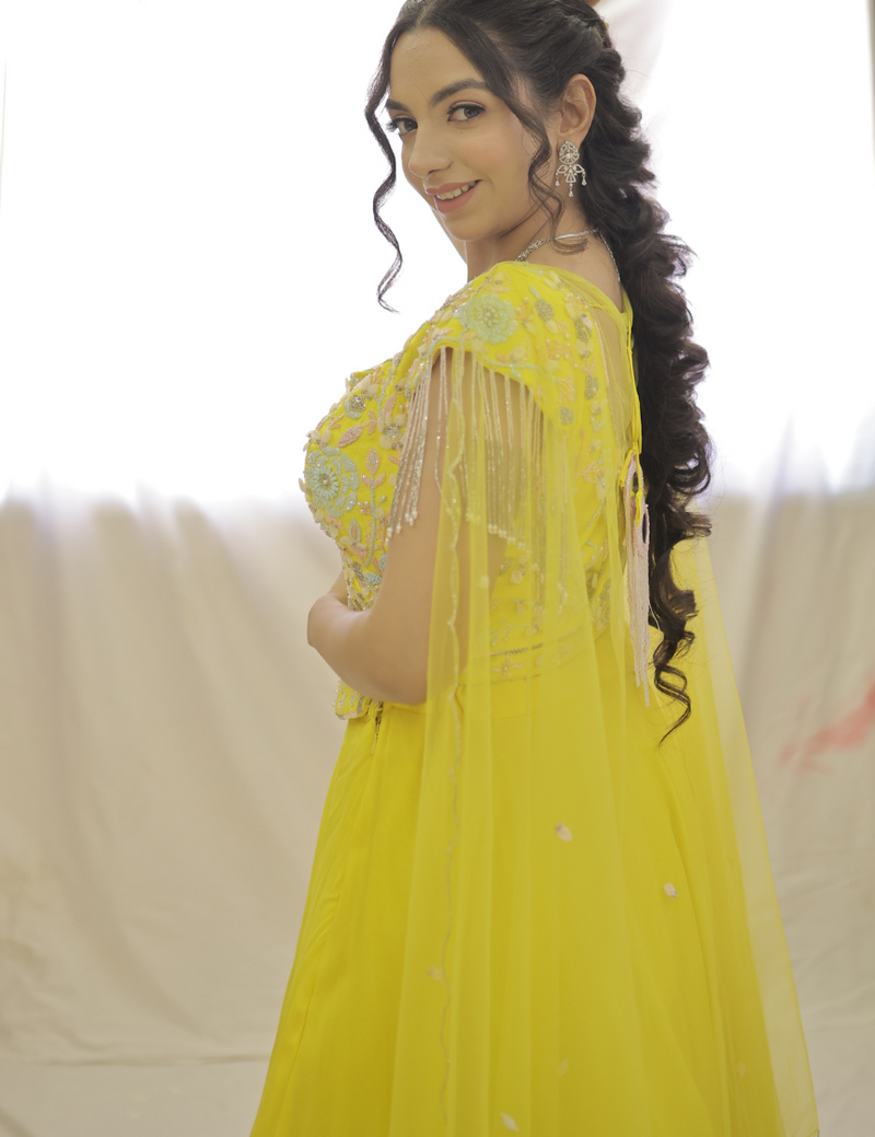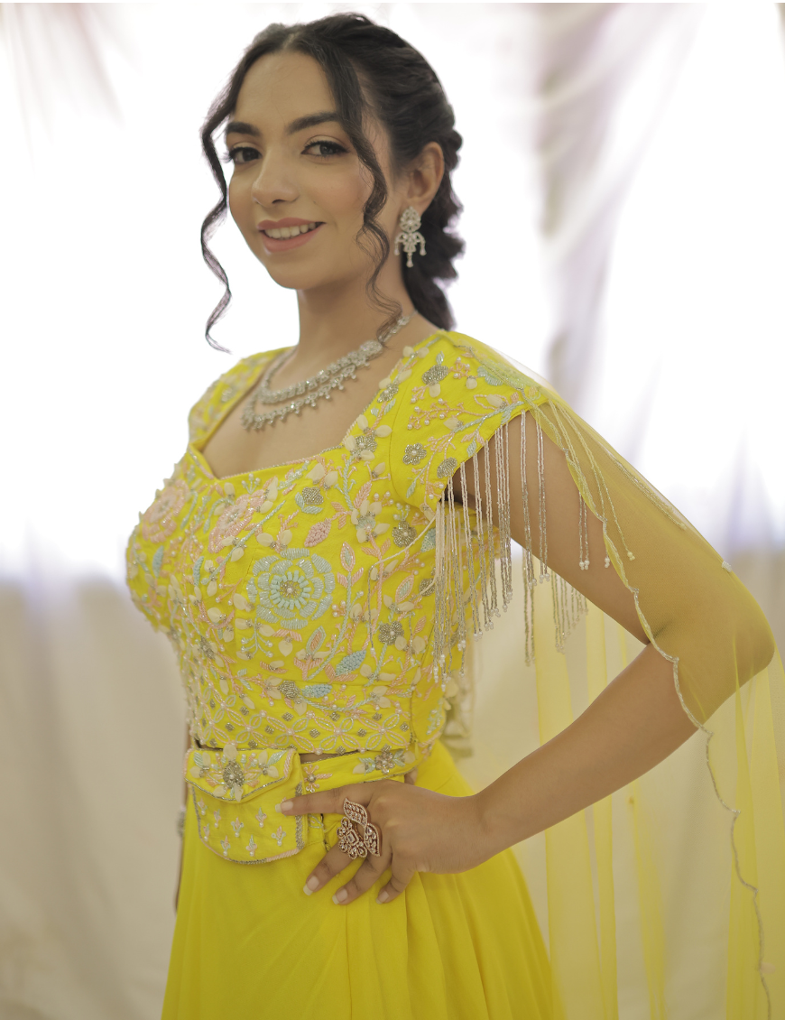 Experience a touch of elegance with Sweet Sunny Days. This beautiful Georgette lehnga set features a bright, yet soft yellow color and delicate pastel katdana handwork. Perfect for adding a pop of color to any occasion, while exuding an air of sophistication. Elevate your wardrobe with this stunning piece.